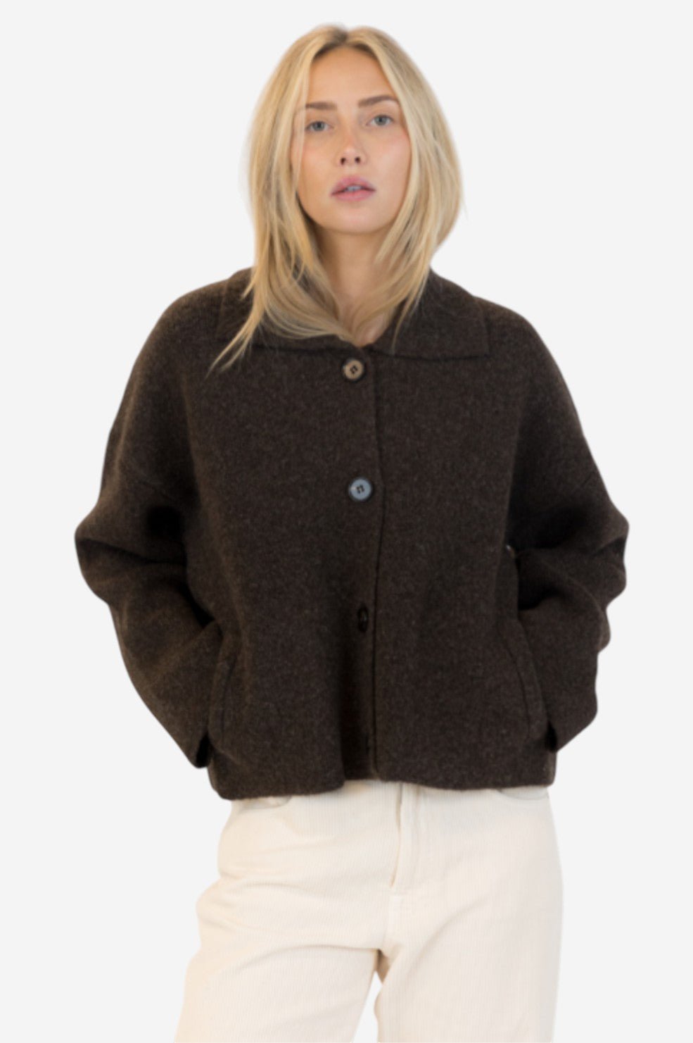 The “Jonah Coat” from Lyla + Luxe is a cozy outer layer with a bold, boxy silhouette—crafted in a thick knit and finished in a rich chocolate brown. Featuring a statement collar, oversized fit, and button-up front, it blends warmth and polish for cold-weather dressing made effortless.